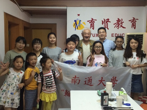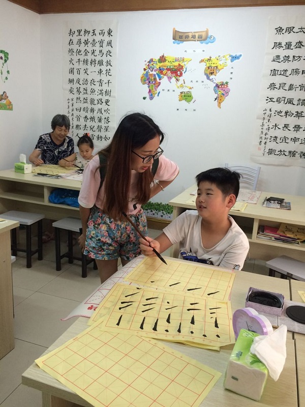 2016年7月5日下午,人妻视频 书法研习社“翰墨书香·书法传情”暑期社会实践小分队成员全体成员在指导老师陈燕飞的带领下,来到学田社区育贤教育机构辅导小学生学习书法。