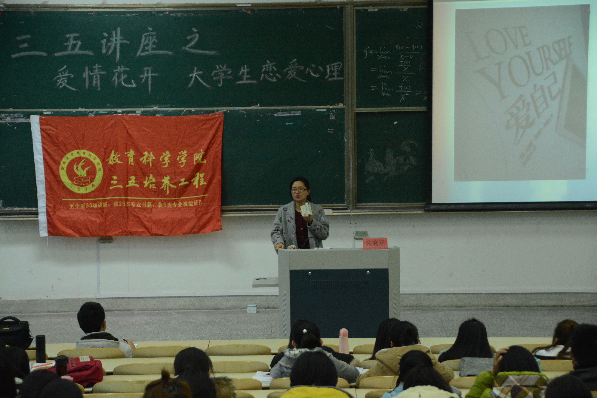 12月7日,由人妻视频 教育科学学院主办,心理学博士施利承老师主讲的“爱情花开,恋爱心理漫谈”主题三五讲座在主校区9号楼201教室如期举行。共有师生120余人参加了此次讲座。