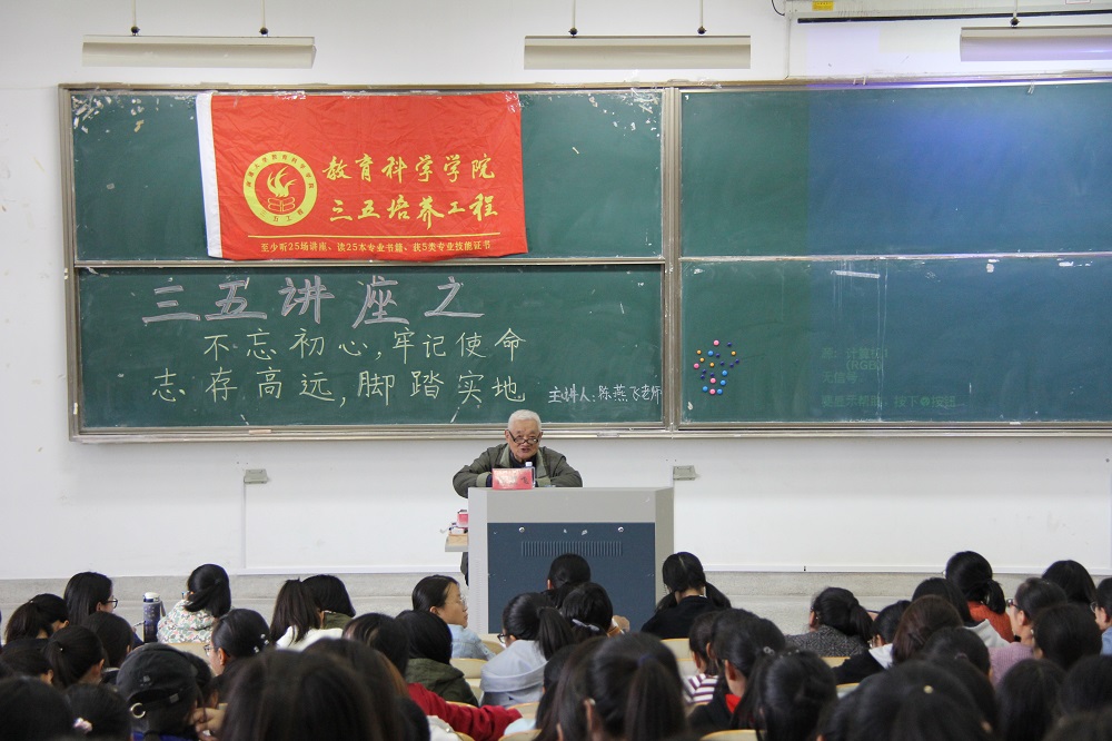 讲座中,近80岁高龄的陈教授登台讲述他对于十九大“不忘初心,牢记使命”的理解,分享他的人生感悟。陈老自1964年进入江苏师范大学工作以来,将53年的时间奉献给了学生,陈老丰富的人生阅历和独特的人格魅力让在场的同学们敬佩不已。