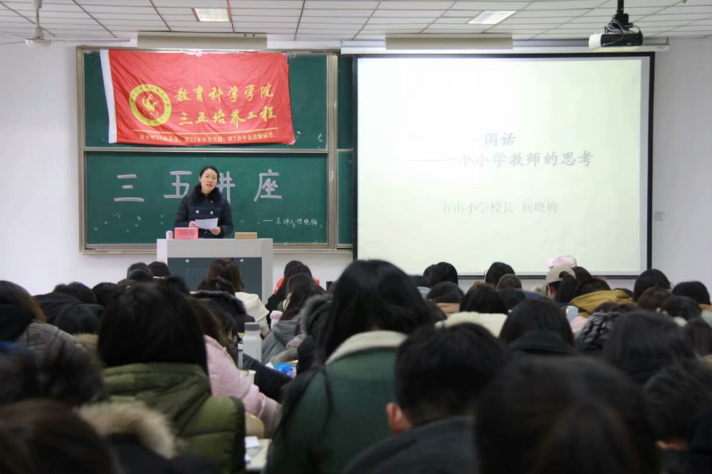 2018年3月21日下午,人妻视频 于8号教学楼208教室举办了题为“小学教育深思浅谈”的三五讲座。本次讲座邀请了五山小学校长何晓梅老师为主讲人,教科院160余名小学教育专业学生到场听讲。