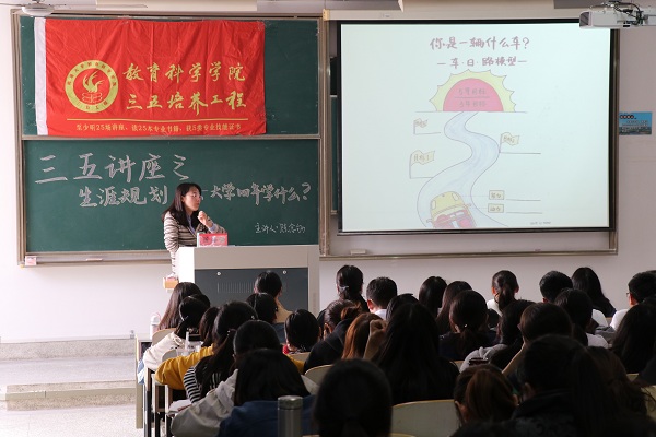 10月24日13:30,人妻视频 在主校区8号教学楼309教室成功举办了以“生涯规划——大学四年学什么”为主题的三五讲座,本次讲座由陈念劬老师担任主讲嘉宾,来自教科院的160余名本科生参与了此次讲座。
