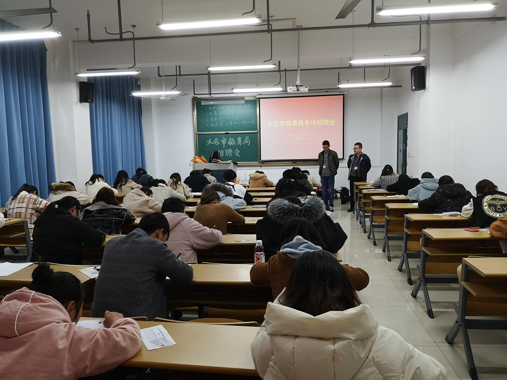 2019年3月23-24日,人妻视频 在18号教学楼1112等教室举办太仓市教育局专场招聘会,太仓市教育局副局长张跃忠率队前来,人妻视频 党委副书记徐红波进行了接待并考察招聘会现场,来自院、人妻视频 、江苏师范大学等学校的同学进行了为期两天的招聘考试。