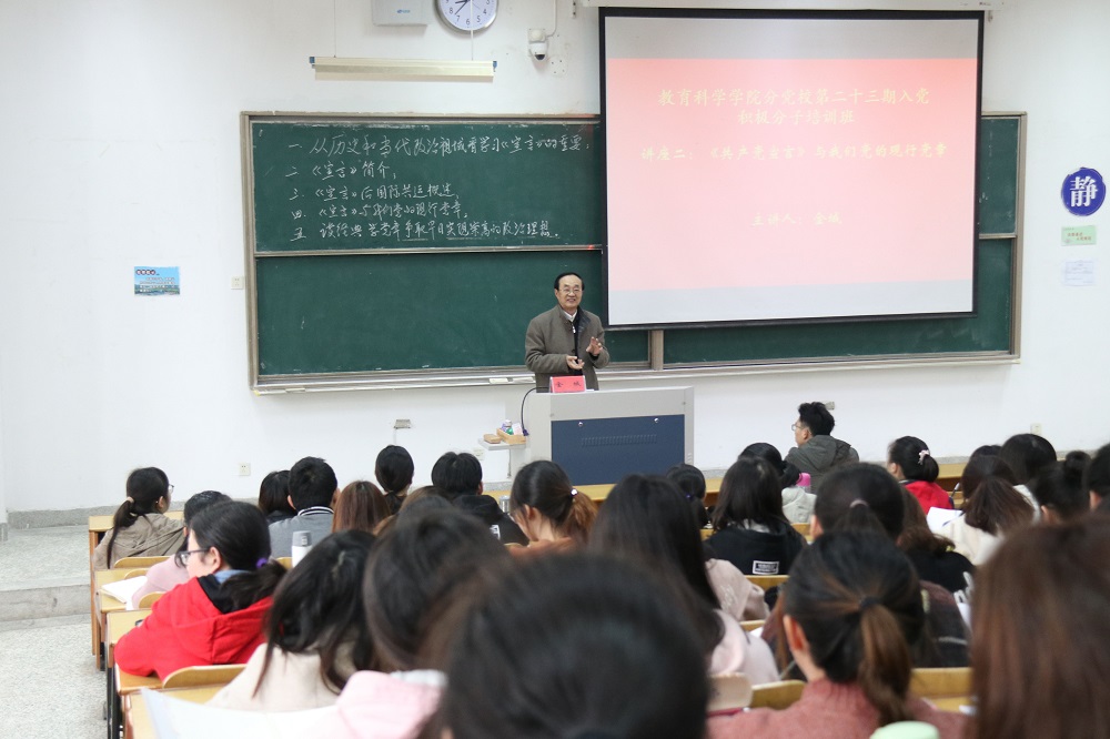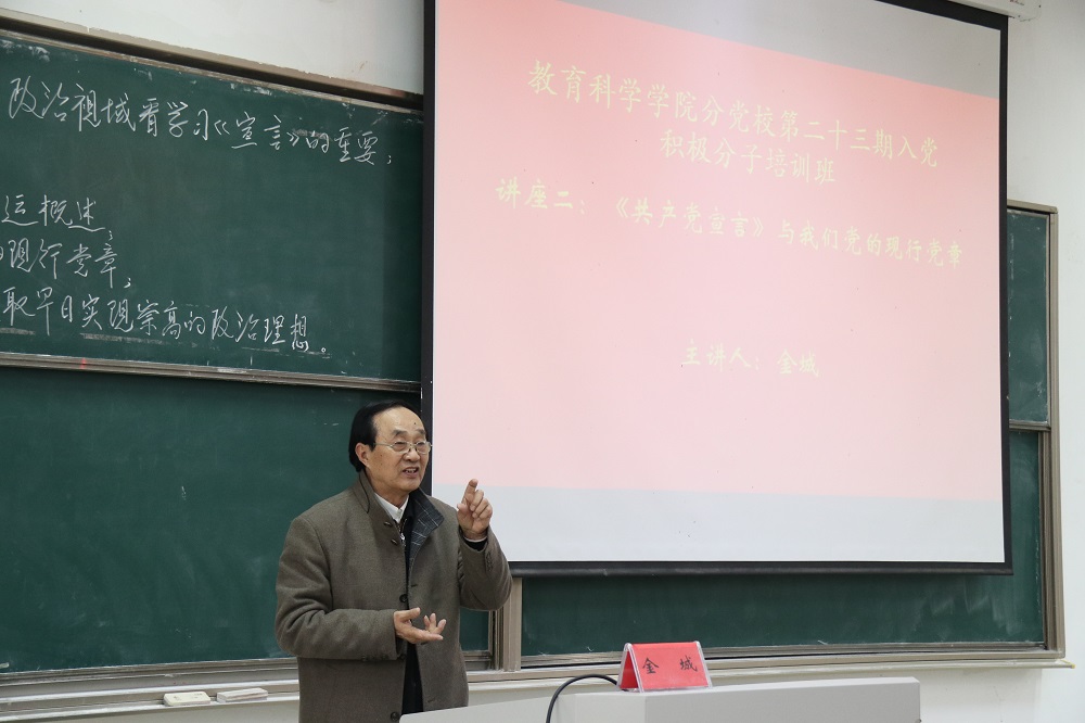 3月30日上午,学院特邀校关心下一代工作委员会常务副主任金城为第二十三期入党积极分子培训班学员作“《共产党宣言》与我们党的现行党章”专题讲座。