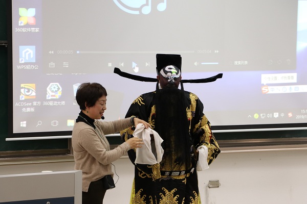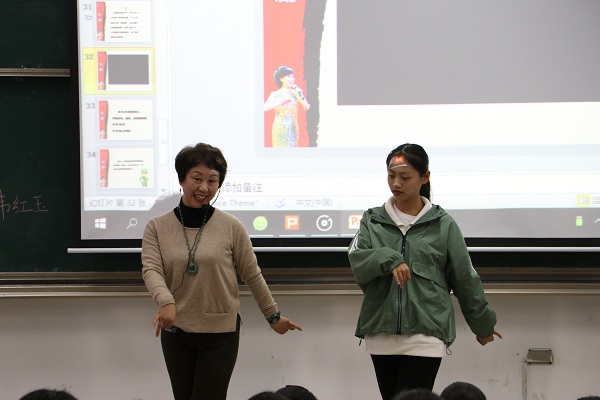 韦红玉向学生们介绍了京剧的历史演化进程,京剧是经历了徽调,汉调的融合,又吸收了汉调、秦腔、昆曲的部分剧目、曲调和表演方法,演变成一种新的声腔,更为悦耳动听,称为“京调”。现在我们称为京剧。韦红玉向学生们介绍京剧的角色:根据男女老少、俊丑正邪,分为生、旦、净、丑四大行当。角色行当的表演各有不同的程式动作:唱,念,做,打,手,眼,身,法,步各有不同的特点,富有舞蹈性和高超的技巧。接着,她和她的团队更是以唱曲的方式,以《贵妃醉酒》与《金玉奴》为例,亲身示范,邀请在坐的同学上台学习京剧的基本手势和动作,整场活动生动有趣,同学们通过观摩、试唱、学习,深深的感受到了京剧的魅力。