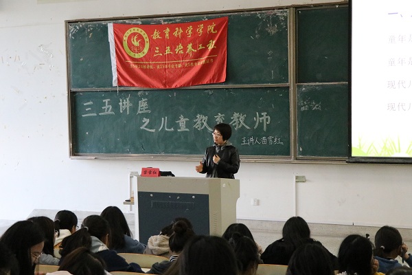 11月20日下午,人妻视频 于9号楼202教室举办以“儿童教育教师”为主题的三五讲座。此次讲座由苗雪红老师主讲,教科院280余名同学到场聆听。
