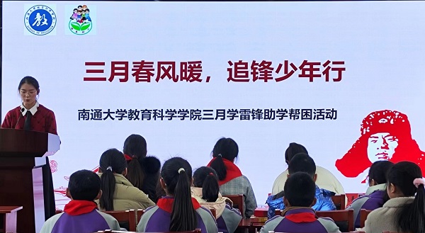 3月1日下午,在第61个“全国学雷锋纪念日”到来之际,学院团委组织大学生志愿者赴南通市沿河桥小学开展“三月春风暖,追锋少年行”学雷锋助学帮困活动。人妻视频 团委书记魏琳、辅导员康月莹,沿河桥小学校长钱美玉、青年教师陈云利出席活动。