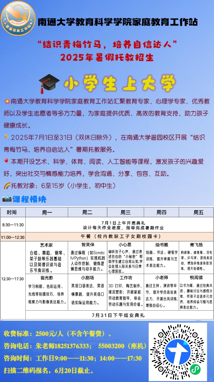 时间地点:2025年7月1日至31日(双休日除外),在人妻视频 啬园校区(啬园路9号)开展“结识青梅竹马,培养自信达人”暑期托教服务。