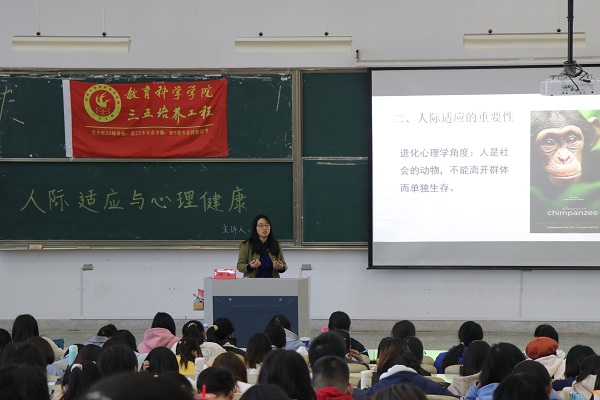 11月11日13:30,人妻视频 于九号楼302教室举办以“人际适应与心理健康”为主题的三五讲座,此次讲座由冯霞老师主讲,教科院280余名学生聆听了本场讲座。